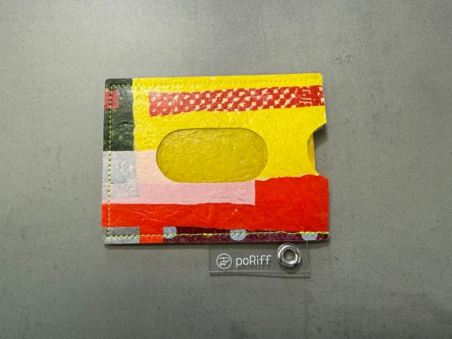 【poRiff_パスケース】 定価¥1,760→¥1,408 ※ミシンの糸の縫い目がガタついているため 【わけあり価格】とさせていただいております。 レジ袋から生まれたこのパスケースは、両面にカードを入れることができ、 クレジットカードやICカード、定期券などをスムーズに取り出せます。 ■ カラー/サイズ/バリエーション ・全て1点物のデザインとなります。 ・サイズは横7.5cm、縦10cm(円5cm×2.5cm) 9.5×7cm以下のカードなら入ります。 ※すべて手作業のため大きさに多少のズレはございます ■ 素材/製造国 ・再生レジ袋を使用しており、環境に配慮した製品です。 ・大阪の施設にて、障がいを抱える方々によって手作業で製造されています。 ■ お手入れ/取り扱い注意事項 ・汚れが気になった際は、柔らかい布で優しく拭き取ってください。 ・高温に近づけると変形の恐れがありますので、ご注意ください。 ・日光が当たる場所に長期間置いておくと傷む恐れがあります。 ■ 発送・注文に関する情報や注意事項 ・毎週水曜日に発送いたします。 ・配送遅延の可能性がございますので、ご了承の上、ご注文ください。 ■ その他の情報や注意事項 ・個々の製品には仕上がりに差がある場合がございます。 ・お使いのディスプレイによって色合いやデザインが異なる場合があります。 製品に関するご質問やご不明点がございましたら、ぜひショップのお問い合わせからお気軽にお尋ねください。あなたの日常にぴったりのパスケースが届くことを楽しみにしています!