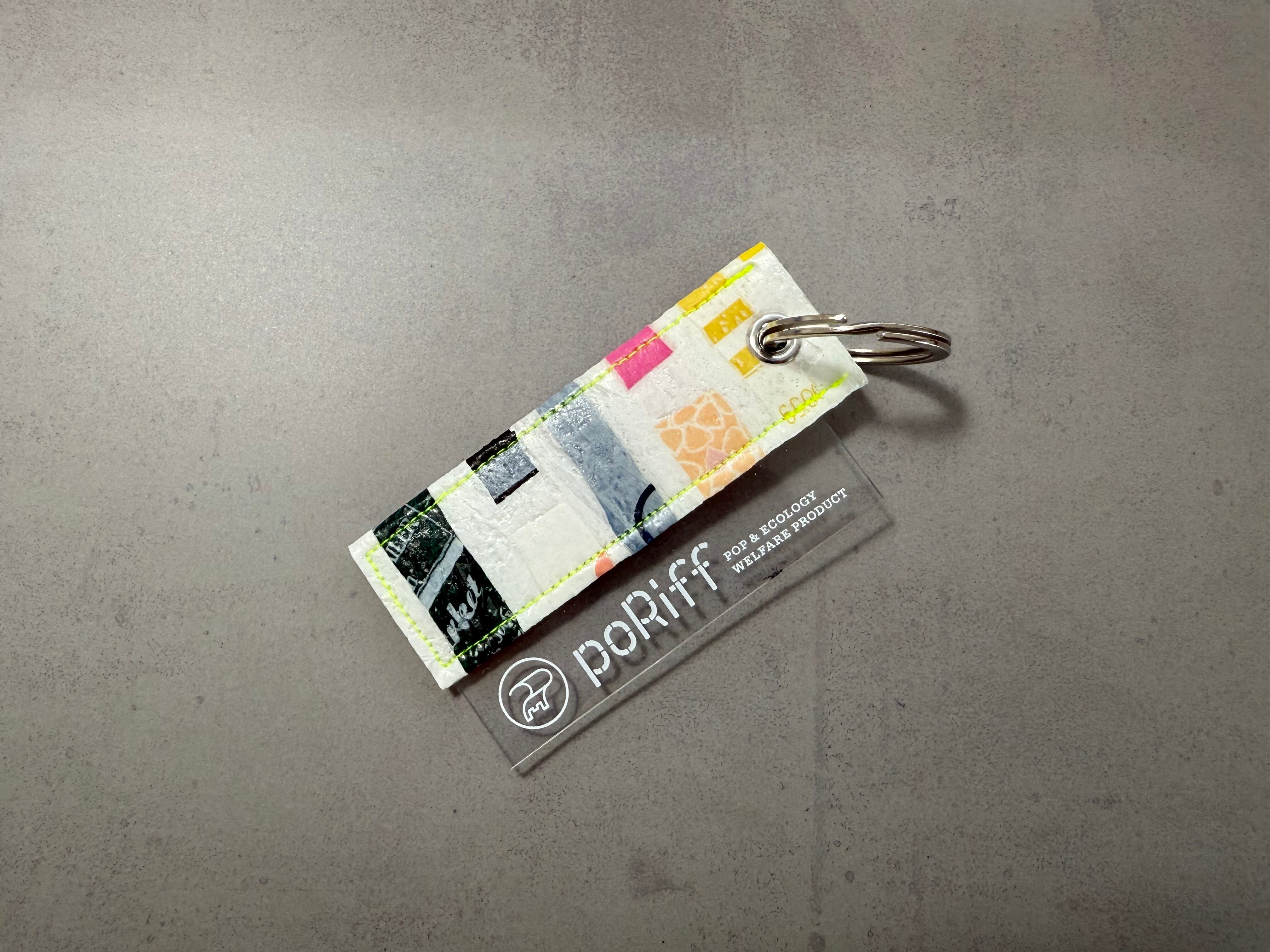 レジ袋から生まれたこのキーホルダーは、ワンポイントアイテムとして色々なものに付ける事ができます。ひとつひとつ違うデザインなのでお楽しみください。プレゼントにもオススメです!
