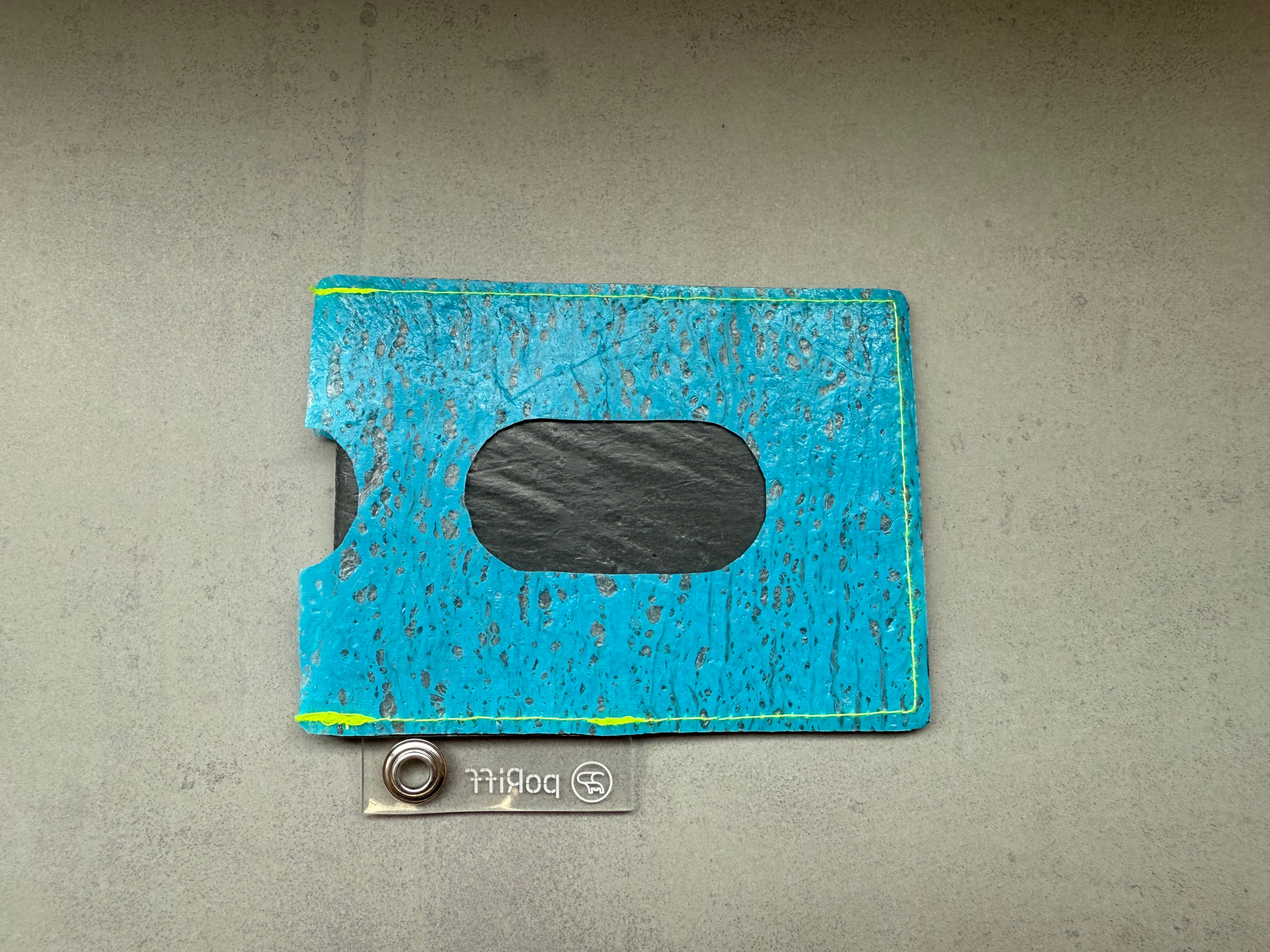 レジ袋から生まれたこのパスケースは、両面にカードを入れることができ、