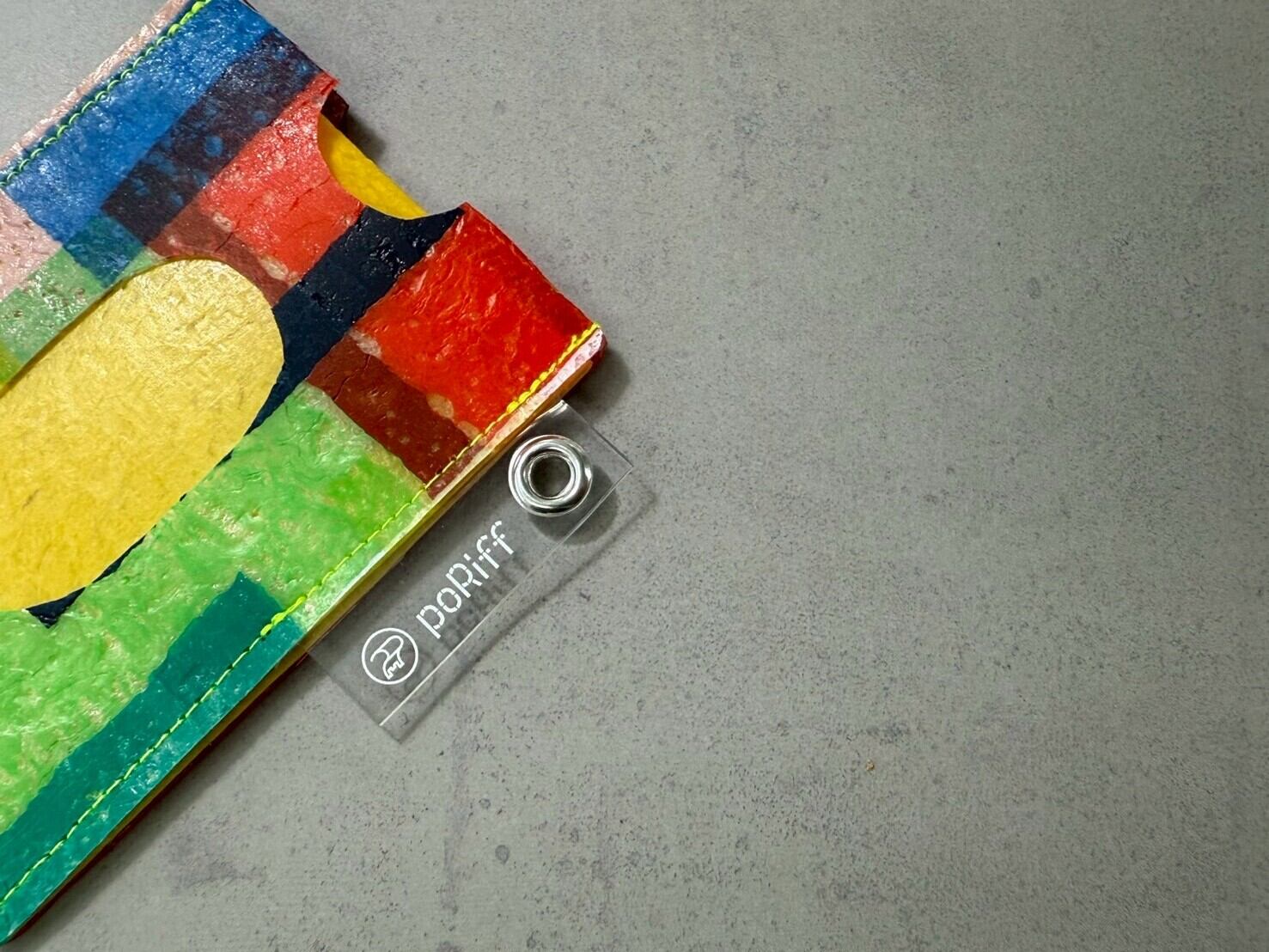 レジ袋から生まれたこのパスケースは、両面にカードを入れることができ、