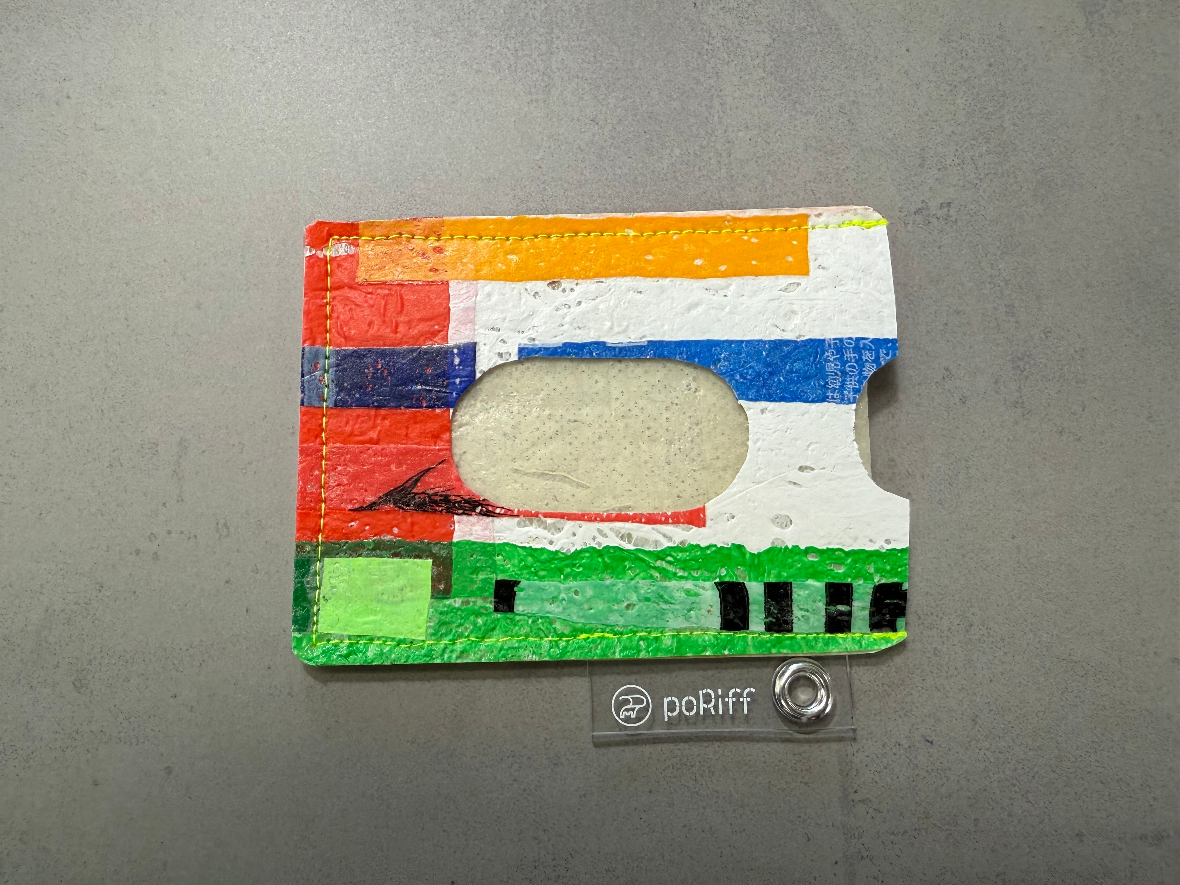 レジ袋から生まれたこのパスケースは、両面にカードを入れることができ、