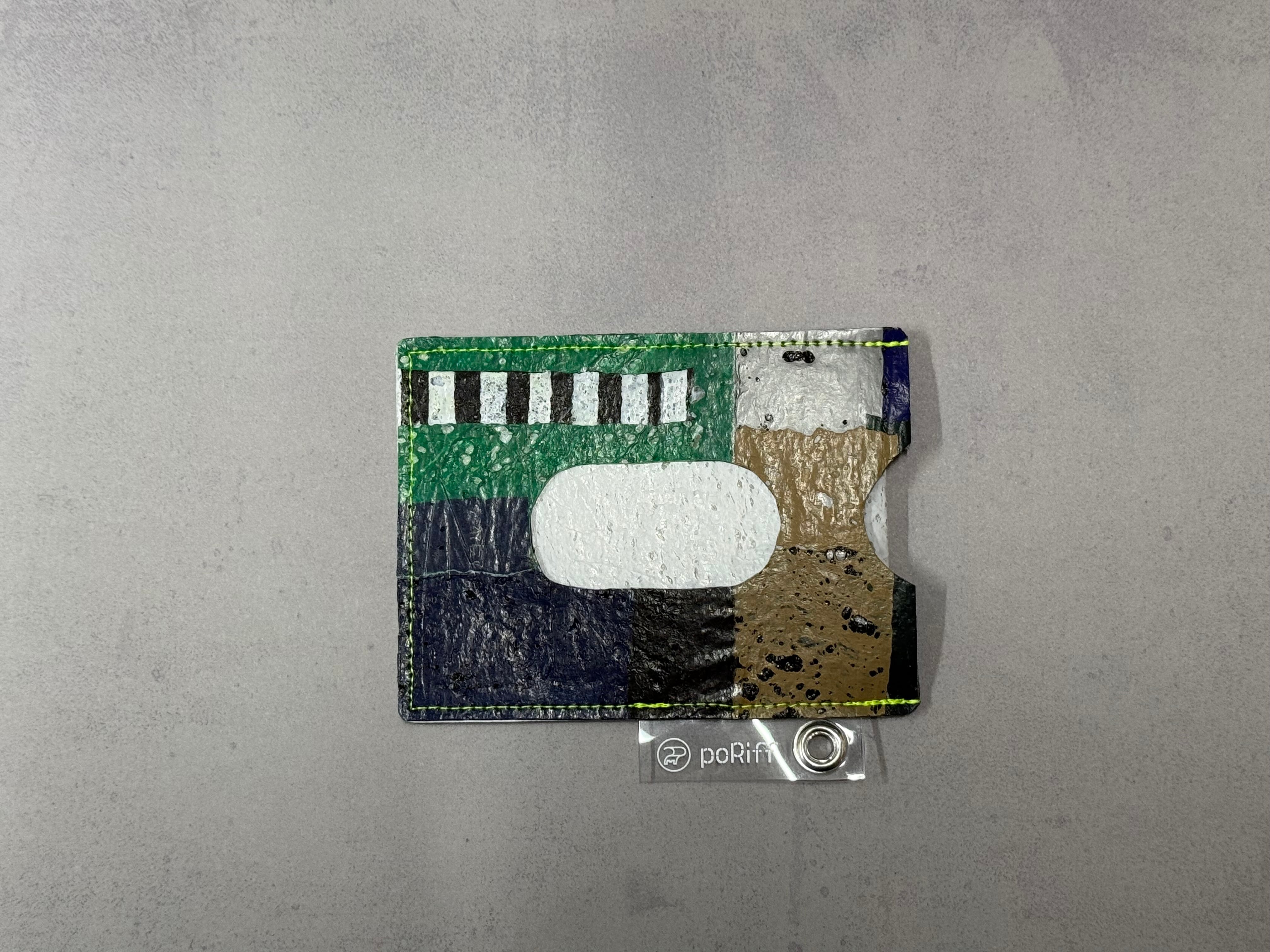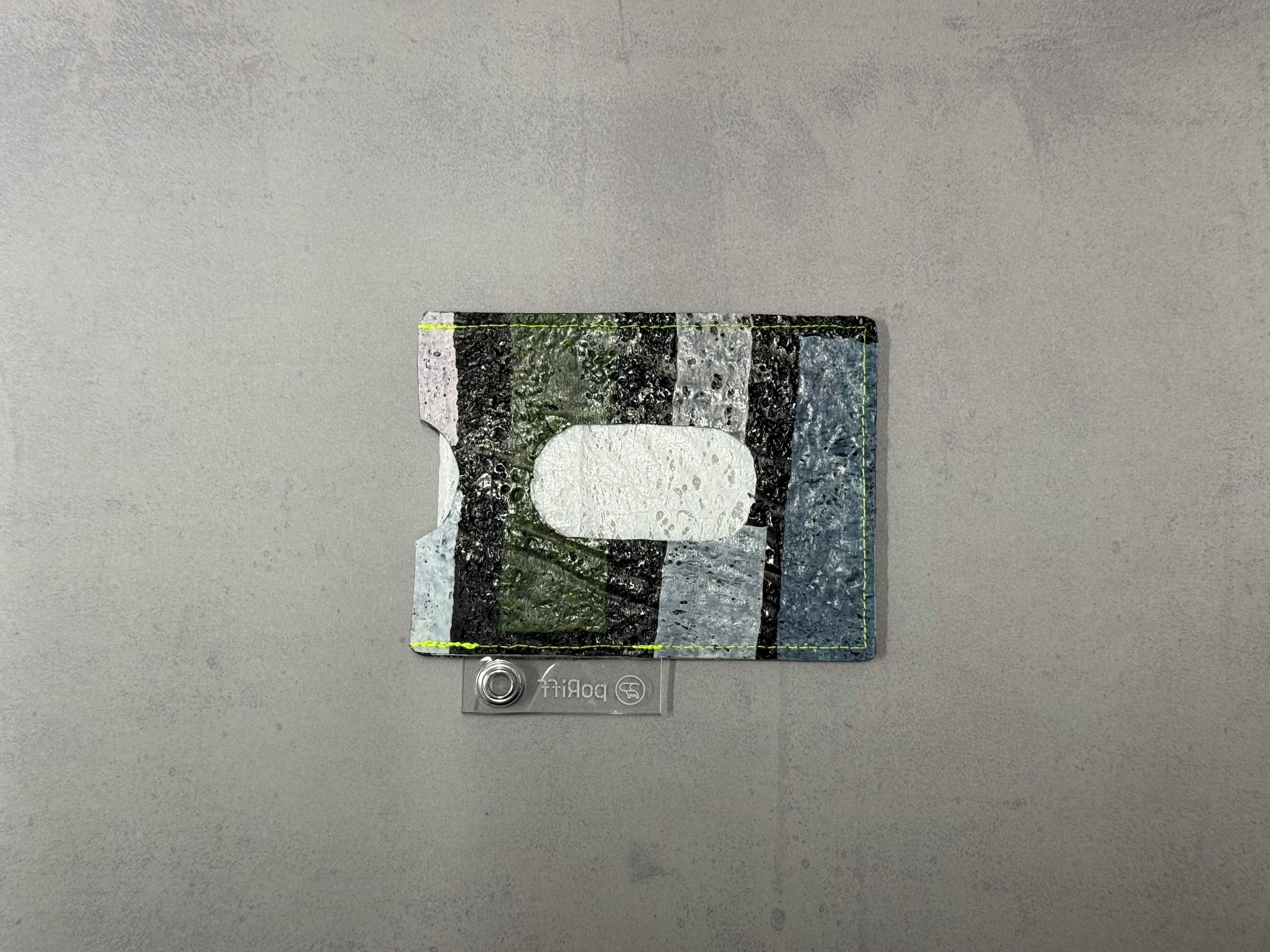 レジ袋から生まれたこのパスケースは、両面にカードを入れることができ、
